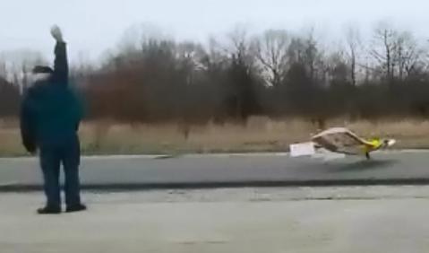 Four subsequent flights were performed on the 4th of April. These tests were aimed at selecting the best propeller by making heavy flights with full acceleration, just like the competition flights, and takeoff distance was measured. The flights were made with 30 lb of payload so the gross weight was in the order of 46 lb. In the picture below Chuck Kime is standing at the 175 ft mark.