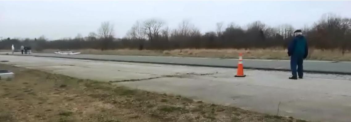 The initial test was for taxi stability and general shakedown with just the wing center section and fuselage components. The tests were conducted on the Widener hockey field, then the parking lot on a weekend. But the real progress was to obtain permission to fly from the old Bridgeport NJ airport site. Widener students and Dave Bevan used this site years ago but in recent times they and everyone else were chased off by the police. However, the site has been sold and one of the Widener students went over and asked permission to do their testing there. Better yet, the runway has been recently repaved, albeit a rather narrow strip. Nonetheless this is a priceless advantage as they can now fly at maximum weight and not worry about tracking in a soft grass strip.