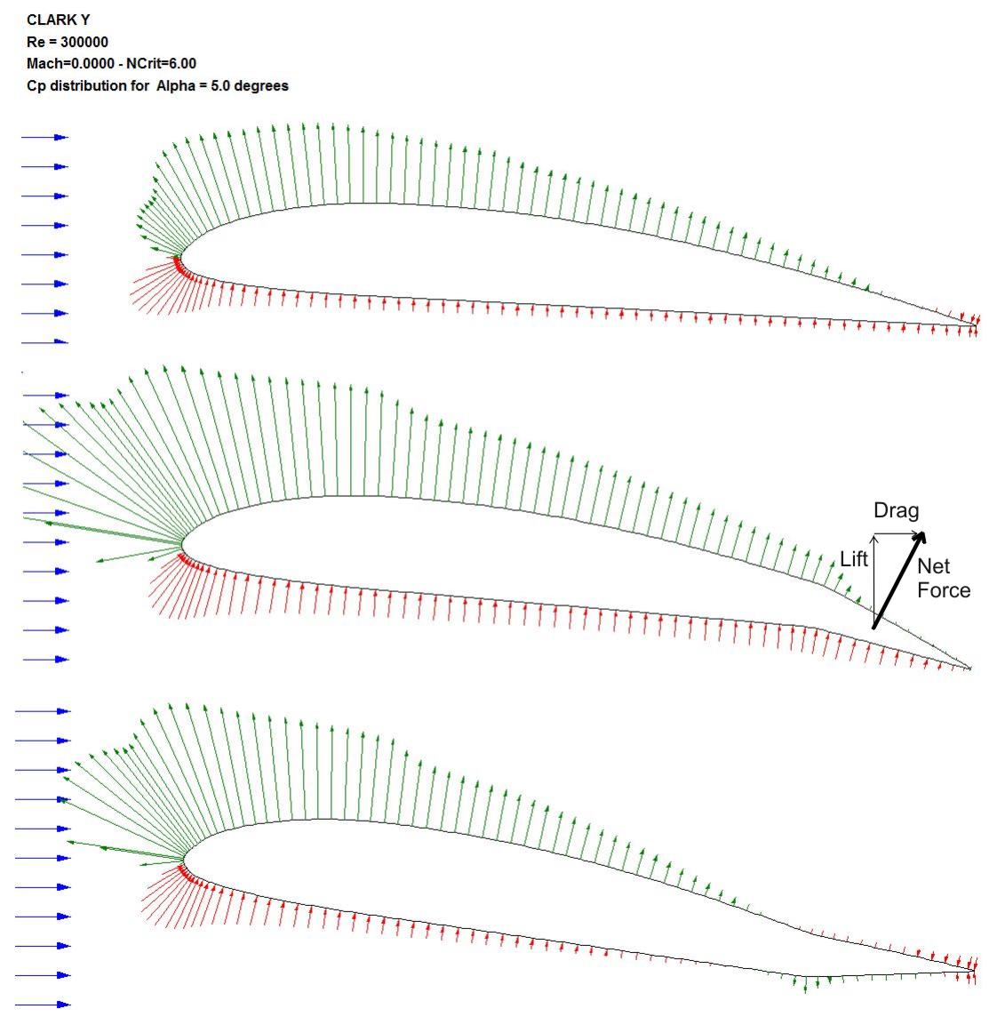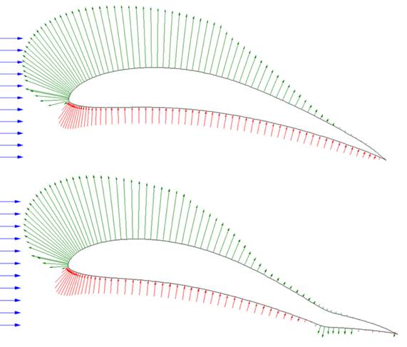 If you are flying an aerobat you want ailerons to provide roll control with no change in any other axis. Unfortunately in steady forward flight an aileron that moves down generates more drag than one that moves up the same amount. This causes the airplane that is rolling to the left, to yaw to the right, and if there is any dihedral in the wing, or dihedral effect due to the wing placement on the fuselage, this effect causes the airplane to experience a right roll moment. The two effects can cancel each other out resulting in the airplane flying straight but with a roll and yaw attitude; Not desirable! Here are the pressure distributions around a conventional Clark Y airfoil with a +/- 10 degree aileron deflection. The pressure is positive with the red arrows and negative (suction) with the blue and the length of the arrow is the magnitude of the pressure at that point.