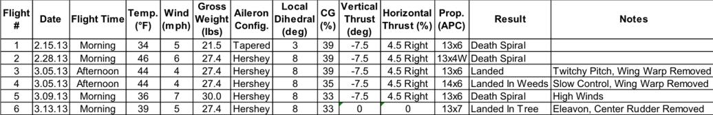 Unfortunately this was a complete failure as the control was nonexistent and cranking the knob did no better than the original mechanization of the ailerons through the sticks. The model quickly crashed into the trees giving the team another major rebuild. Here is a summary of the flights todate;