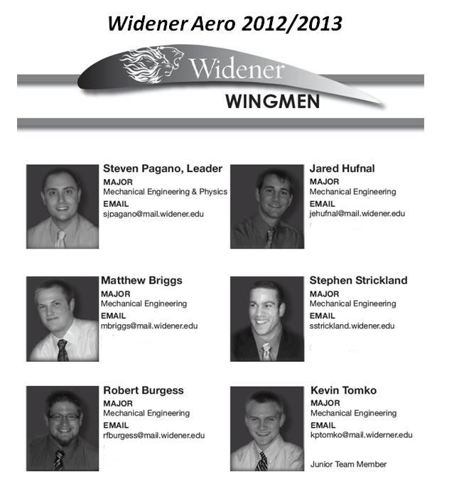 This is my attempt to document the progress of the Widener 2012/13 SAE Aero Design Competition Team activities from the late build stage through some flight testing and then on to the Competition. Here is the team;