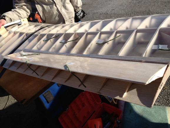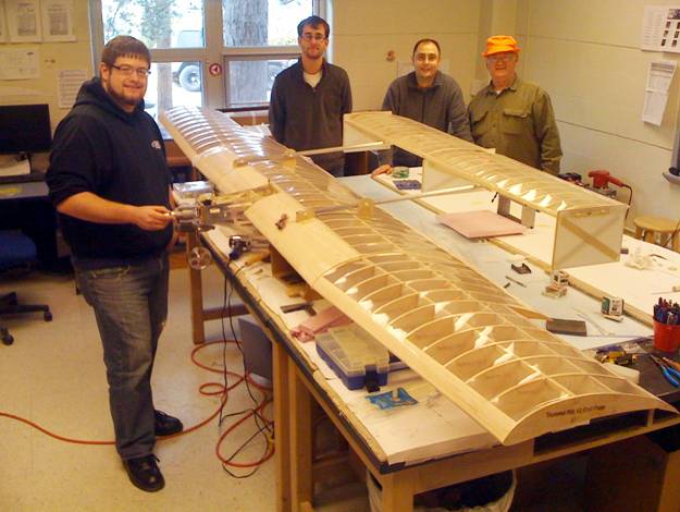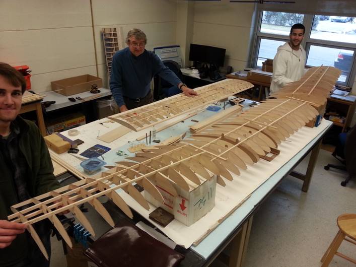 The Widener students making progress in constructing their entry in the SAE Aero competition. The model has a twelve foot wing with two foot chord and a large close coupled tail shown here. They had the ribs laser cut from CAD files they developed. The model will be expected to fly powered by an OS FX61 at about 55 pounds gross weight of which 40 pounds will be payload. They have managed to find some tungsten rods for the ballast making the payload box as small as possible. The rules forbid them from using lead, nor can they use fiber reinforced structures. Watch this space for updates as the model comes together and flight tests begin in the February time frame.