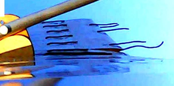 In the photos below from the test flight on 23rd March you can see the split aileron behaved just as the analysis predicted. In the picture below you can see the tufts on the upper aft end of the aileron have been sucked back under the aileron into the cavity below; just like the analysis sugested. And better yet, the model was controllable although the flight was rather like Mr Rabbit's Wild Ride at Disneyland. But the model survived and a continuing series of flight tests are planned as they build a second and third model to be shipped to California for the competition