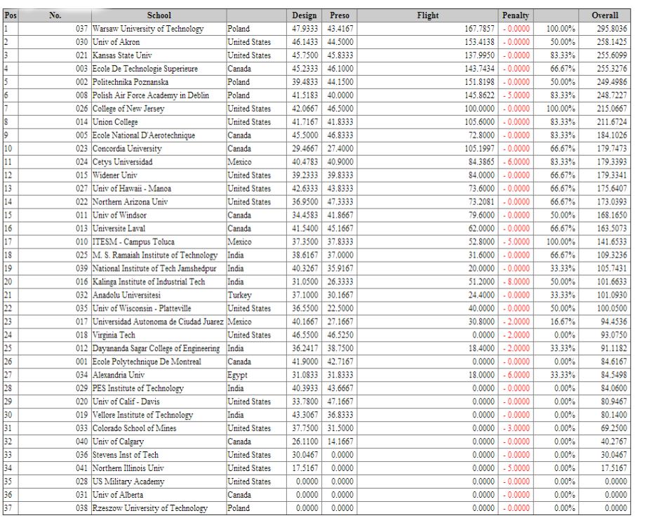 The award ceremony was complete with the Widener Team in twelth place out of 42 entries in the Standard Class. the highest weight we flew was 21 lb. The top three teams lifted more than 35 lb, so that is the mark for next year's team. It can be done! There are many lessons learned that will be transmitted to the 2013/14 team.