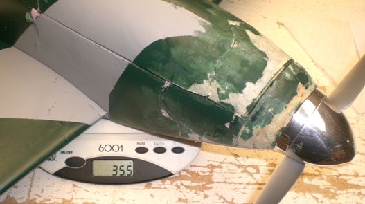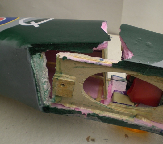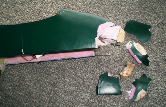 The nose crushed in the underside foam parts and the side foam parts broke rather cleanly. The motor mount ply part separated from its mating balsa nose parts and the cowling broke into three parts, rather cleanly thankfully. Indeed, most of these parts could be fitted back together mostly in alignment.