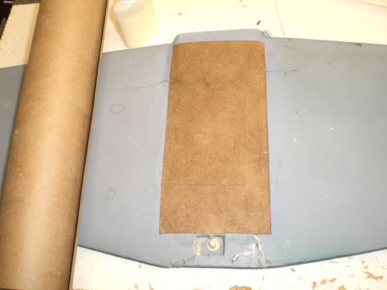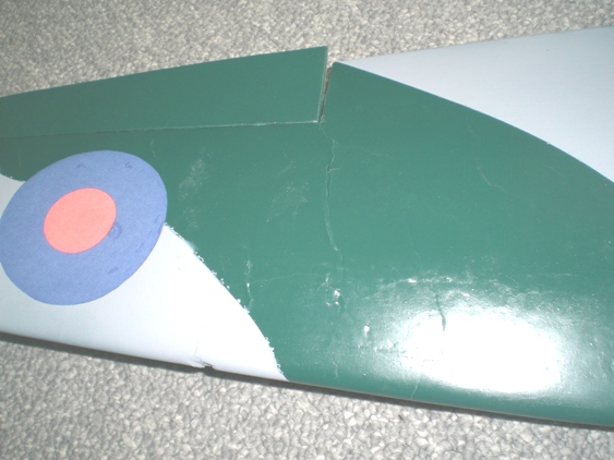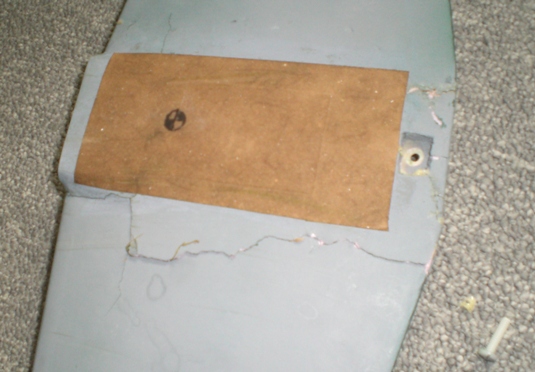I found that the wing cracks could be forced back into place with a pair of very long rubber bands from tip to tip. Now the next decisions involved the adhesives for these fixes. Clearly I must use foam safe adhesives and with these kinds of joints it is desirable to have a slow curing, gap filling adhesive. This slow cure makes the job tedious, as you glue a part then wait half a day or so before tackling the next part, but the results are better. The adhesive choices for me are epoxy, yellow wood glue and polyurethane glue (Gorilla or Elmer's Professional). The latter really does a good job on broken parts that are bruised or don't fit back well. The yellow and white wood glues also do an excellent job on foam except they air dry and so only work on joints that are close to the surface. If it is a deep thick part the glue in the middle never sets. On the wing I used polyurethane Then I added a brown paper doubler, wetted with water then glued in place with thinned white glue.