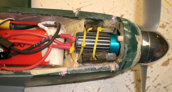 I also checked the CG and found it to be right on the wing CP! Probably not a good place with this small tail. I haven't done the stability calculations but it didn't seem tail heavy in either flight, nevertheless, it is probably a good idea to add a bit of nose weight for a bit more stability. So I lashed two small wheel weights to the motor.