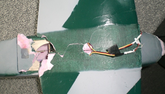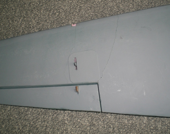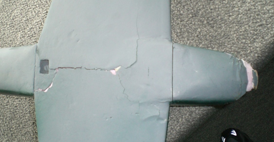 The wing mounting reinforced center section separated, allowing the wing to separate from the fuselage. The wing also suffered cracking both top and bottom in the foam "skins". All these parts fitted together well. The spars and center joiner seemed to remain intact. There are also creases in the wing skins a few inches outboard of center on both sides, but this is more of a bruise than a separation.