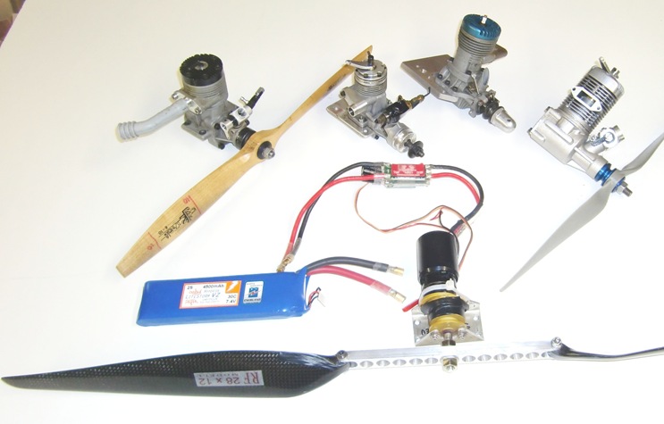 Now to work on the engine powered configurations. Looking at the Euro calendar I realized with a suitable engine I could also fly in the Old Timer Limited Engine Run event and I asked Ed Hamler if he had a spare Anderson Spitfire to loan me. He not only had a spare but was delighted to mail it to me and I began to plan the installation. Both the Texaco diesels and the Anderson Spitfire are much heavier than the electric motor setup, but then the model must fly at 10 ounces per square foot wing loading for them vice eight ounces for the electric. Trouble is, the heavy engines make the model nose heavy so it will be a challenge to balance them. I will move the radio battery from the firewall back to the stab area in the fuselage but more ballast will be necessary and much of it in the tail cone. Here are the three propulsion systems for the Euros.